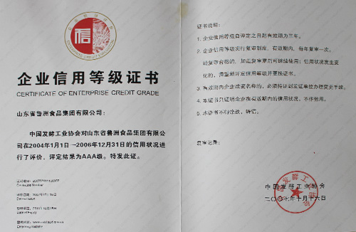 發(fā)酵行業(yè)企業(yè)信用評價AAA級